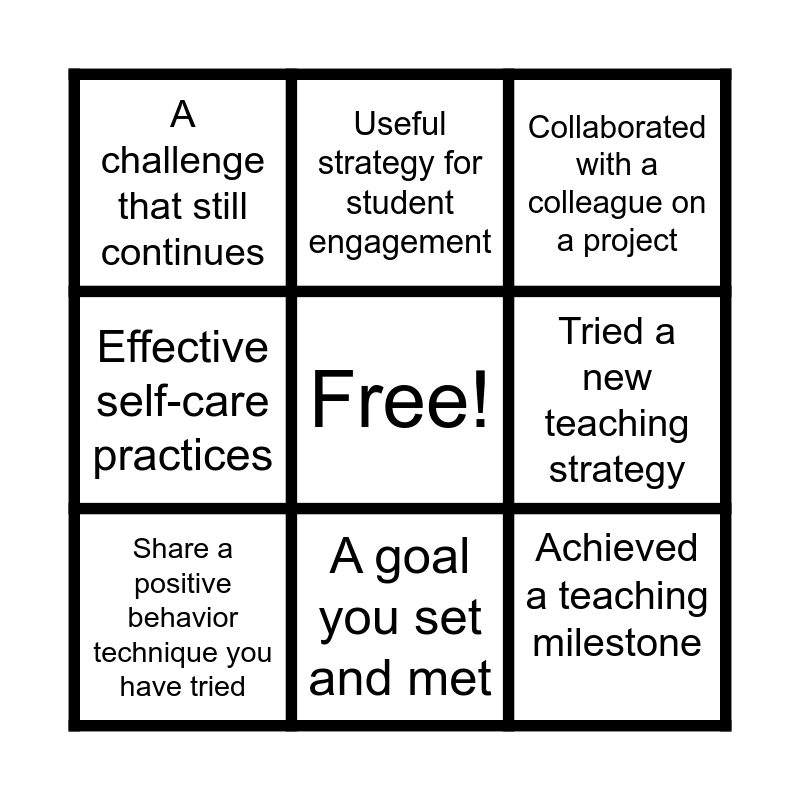 This bingo card has a free space and 8 words: Tried a new teaching strategy, Collaborated with a colleague on a project, Useful strategy for student engagement, Share a positive behavior technique you have tried, A challenge that still continues, Achieved a teaching milestone, Effective self-care practices and A goal you set and met.