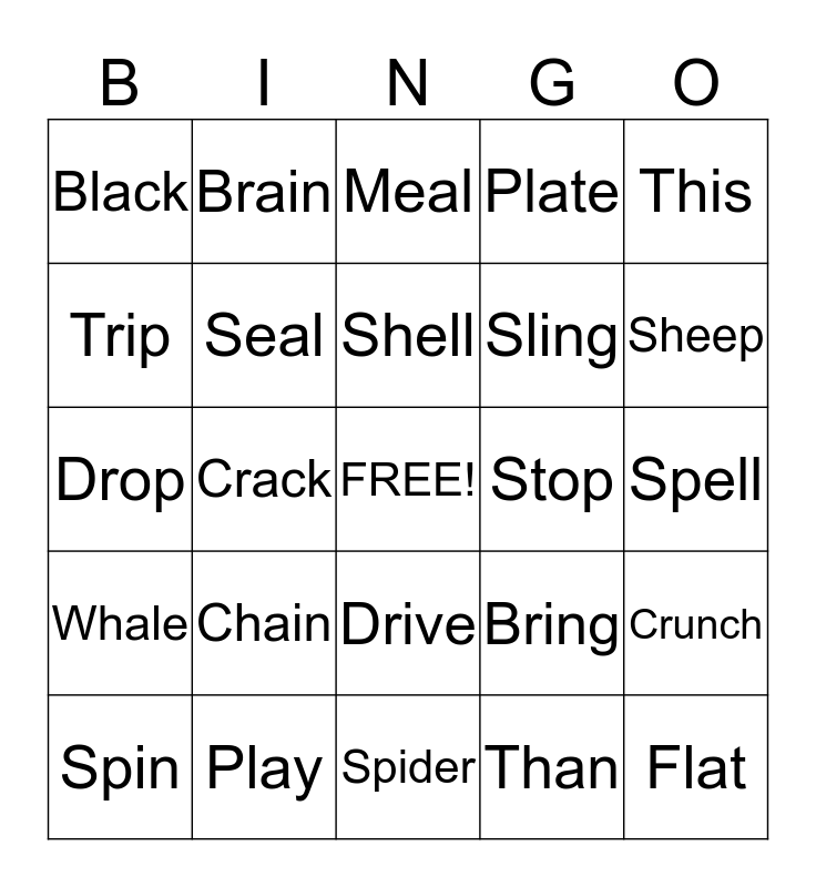 This bingo card has a free space and 24 words: Chain, Play, Shell, Spin, This, Black, Trip, Brain, Stop, Drive, Sling, Drop, Bring, Crunch, Seal, Than, Spell, Meal, Sheep, Crack, Flat, Whale, Plate and Spider.