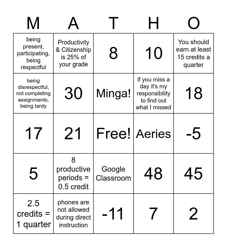 This bingo card has a free space and 24 words: 8 productive periods = 0.5 credit, phones are not allowed during direct instruction, Minga!, 2.5 credits = 1 quarter, You should earn at least 15 credits a quarter, being present, participating, being respectful, being disrespectful, not completing assignments, being tardy, Productivity & Citizenship is 25% of your grade, Aeries, Google Classroom, If you miss a day it's my responsibility to find out what I missed, 17, 48, 45, 30, 7, -5, 8, 18, 21, 2, 5, 10 and -11.