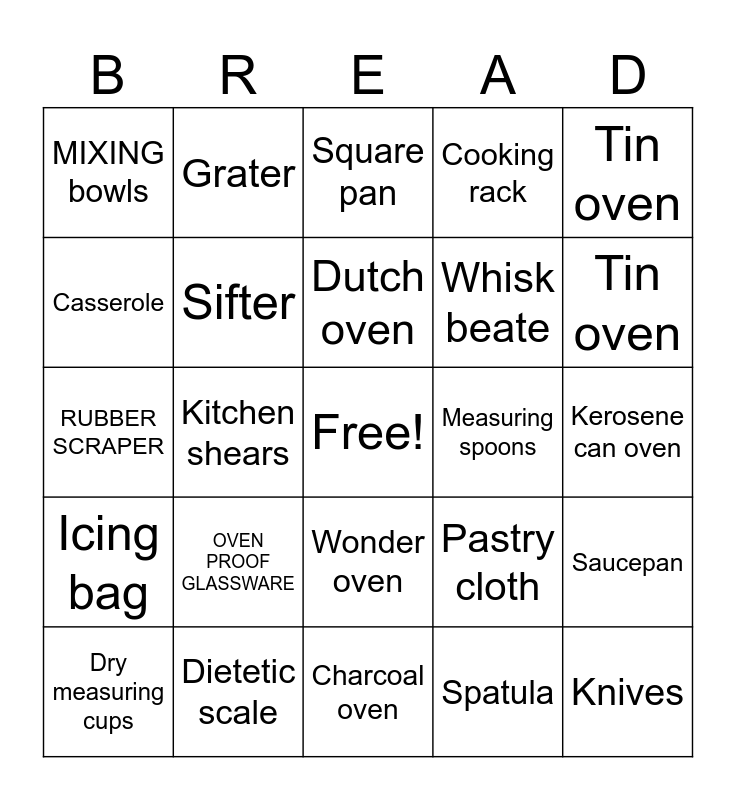 This bingo card has a free space and 24 words: Dry measuring cups, OVEN PROOF GLASSWARE, Dutch oven, Spatula, Tin oven, MIXING bowls, Grater, Square pan, Measuring spoons, Kerosene can oven, RUBBER SCRAPER, Sifter, Pastry cloth, Saucepan, Casserole, Dietetic scale, Charcoal oven, Cooking rack, Tin oven, Icing bag, Kitchen shears, Wonder oven, Whisk beate and Knives.