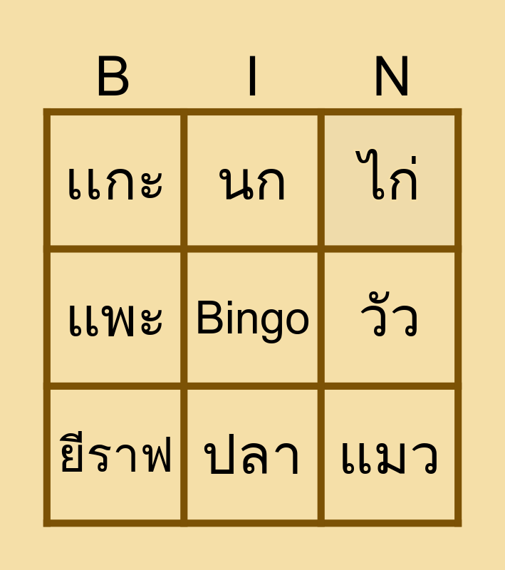 This bingo card has a free space and 11 words: ช้าง, ปลา, แมว, ยีราฟ, นก, ไก่, วัว, ม้า, แพะ, เเกะ and หนู.