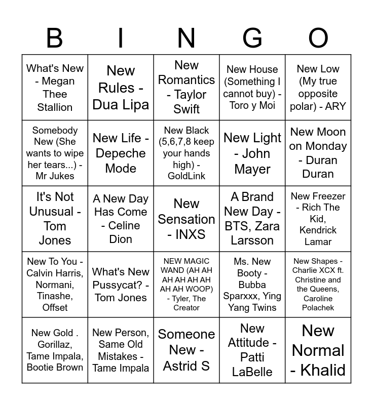 This bingo card has a free space and 24 words: What's New Pussycat? - Tom Jones, New Person, Same Old Mistakes - Tame Impala, New Black (5,6,7,8 keep your hands high) - GoldLink, New Gold . Gorillaz, Tame Impala, Bootie Brown, New Low (My true opposite polar) - ARY, What's New - Megan Thee Stallion, Somebody New (She wants to wipe her tears...) - Mr Jukes, New Rules - Dua Lipa, A Brand New Day - BTS, Zara Larsson, NEW MAGIC WAND (AH AH AH AH AH AH AH AH WOOP) - Tyler, The Creator, New Light - John Mayer, It's Not Unusual - Tom Jones, Ms. New Booty - Bubba Sparxxx, Ying Yang Twins, New Shapes - Charlie XCX ft. Christine and the Queens, Caroline Polachek, New Life - Depeche Mode, New Attitude - Patti LaBelle, New Freezer - Rich The Kid, Kendrick Lamar, New Romantics - Taylor Swift, New Moon on Monday - Duran Duran, A New Day Has Come - Celine Dion, New Normal - Khalid, New To You - Calvin Harris, Normani, Tinashe, Offset, New House (Something I cannot buy) - Toro y Moi and Someone New - Astrid S.