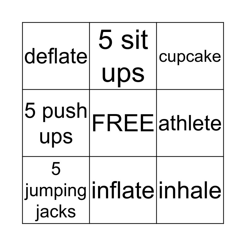 This bingo card has a free space and 8 words: athlete, cupcake, 5 sit ups, 5 jumping jacks, deflate, inhale, 5 push ups and inflate.
