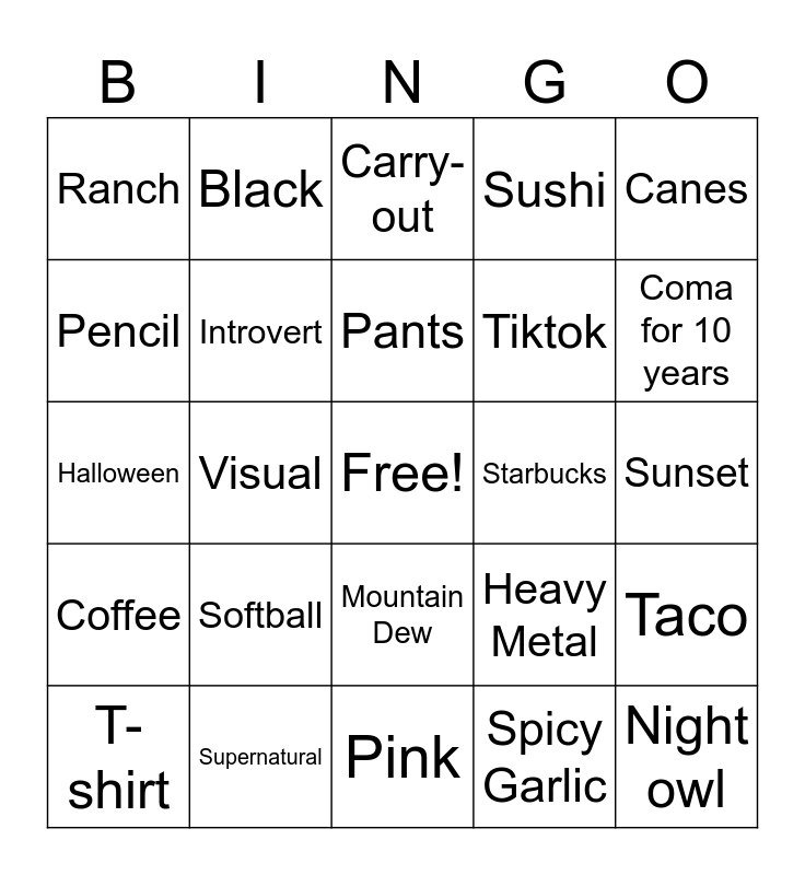 This bingo card has a free space and 24 words: Softball, Supernatural, Pants, T-shirt, Canes, Ranch, Pencil, Black, Starbucks, Mountain Dew, Tiktok, Halloween, Heavy Metal, Taco, Introvert, Spicy Garlic, Sunset, Carry-out, Coma for 10 years, Visual, Night owl, Coffee, Sushi and Pink.