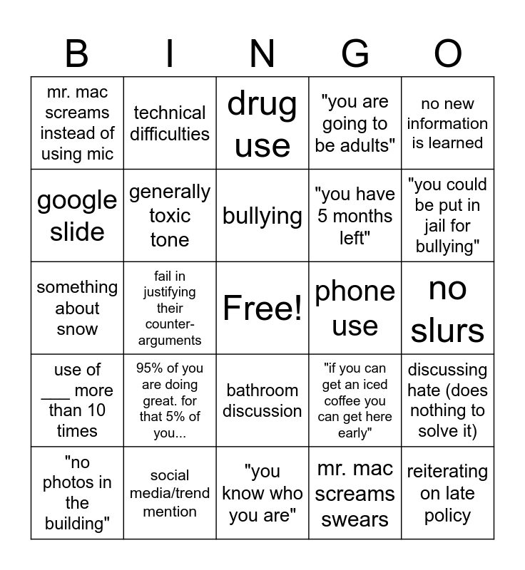 This bingo card has a free space and 24 words: 95% of you are doing great. for that 5% of you..., social media/trend mention, bullying, "no photos in the building", no new information is learned, mr. mac screams instead of using mic, google slide, technical difficulties, phone use, bathroom discussion, "you have 5 months left", something about snow, "if you can get an iced coffee you can get here early", discussing hate (does nothing to solve it), generally toxic tone, mr. mac screams swears, no slurs, drug use, "you could be put in jail for bullying", fail in justifying their counter-arguments, reiterating on late policy, use of ___ more than 10 times, "you are going to be adults" and "you know who you are".