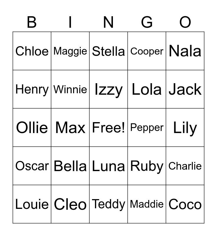 This bingo card has a free space and 24 words: Bella, Cleo, Izzy, Louie, Nala, Chloe, Henry, Maggie, Pepper, Luna, Lola, Ollie, Ruby, Charlie, Winnie, Maddie, Lily, Stella, Jack, Max, Coco, Oscar, Cooper and Teddy.