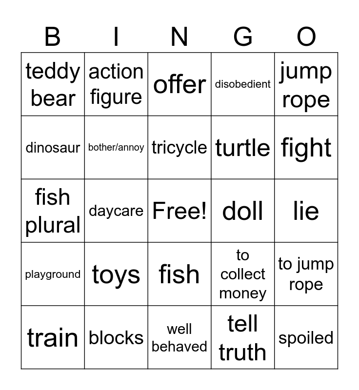 This bingo card has a free space and 24 words: toys, blocks, tricycle, train, jump rope, teddy bear, dinosaur, action figure, doll, fish, turtle, fish plural, to collect money, to jump rope, bother/annoy, tell truth, lie, offer, fight, daycare, spoiled, playground, disobedient and well behaved.