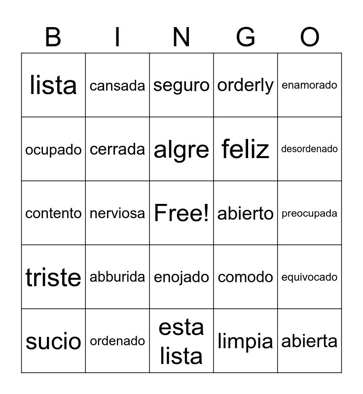 This bingo card has a free space and 24 words: abburida, ordenado, algre, sucio, enamorado, lista, ocupado, cansada, abierto, enojado, feliz, contento, comodo, equivocado, cerrada, limpia, preocupada, seguro, desordenado, nerviosa, abierta, triste, orderly and esta lista.