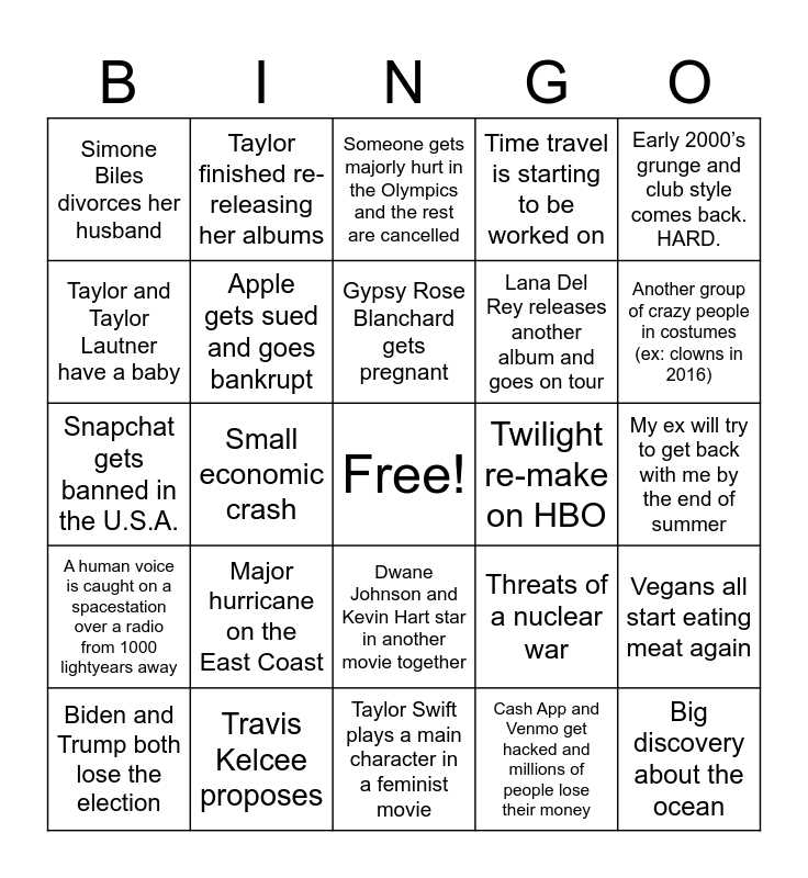This bingo card has a free space and 24 words: Major hurricane on the East Coast, Travis Kelcee proposes, Gypsy Rose Blanchard gets pregnant, Biden and Trump both lose the election, Early 2000’s grunge and club style comes back. HARD., Simone Biles divorces her husband, Taylor and Taylor Lautner have a baby, Taylor finished re-releasing her albums, Twilight re-make on HBO, Dwane Johnson and Kevin Hart star in another movie together, Lana Del Rey releases another album and goes on tour, Snapchat gets banned in the U.S.A., Threats of a nuclear war, Vegans all start eating meat again, Apple gets sued and goes bankrupt, Cash App and Venmo get hacked and millions of people lose their money, My ex will try to get back with me by the end of summer, Someone gets majorly hurt in the Olympics and the rest are cancelled, Another group of crazy people in costumes (ex: clowns in 2016), Small economic crash, Big discovery about the ocean, A human voice is caught on a spacestation over a radio from 1000 lightyears away, Time travel is starting to be worked on and Taylor Swift plays a main character in a feminist movie.