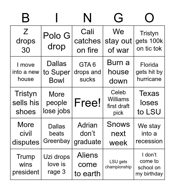This bingo card has a free space and 24 words: Dallas beats Greenbay, Uzi drops love is rage 3, GTA 6 drops and sucks, Trump wins president, Tristyn gets 100k on tic tok, Z drops 30, I move into a new house, Polo G drop, Celeb Williams first draft pick, Adrian don’t graduate, Burn a house down, Tristyn sells his shoes, Snows next week, We stay into a recession, Dallas to Super Bowl, LSU gets championship, Texas loses to LSU, Cali catches on fire, Florida gets hit by hurricane, More people lose jobs, I don’t come to school on my birthday, More civil disputes, We stay out of war and Aliens come to earth.