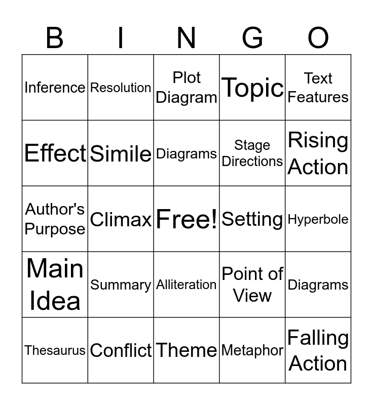This bingo card has a free space and 24 words: Summary, Conflict, Diagrams, Thesaurus, Text Features, Inference, Effect, Resolution, Setting, Alliteration, Stage Directions, Author's Purpose, Point of View, Diagrams, Simile, Metaphor, Hyperbole, Plot Diagram, Rising Action, Climax, Falling Action, Main Idea, Topic and Theme.