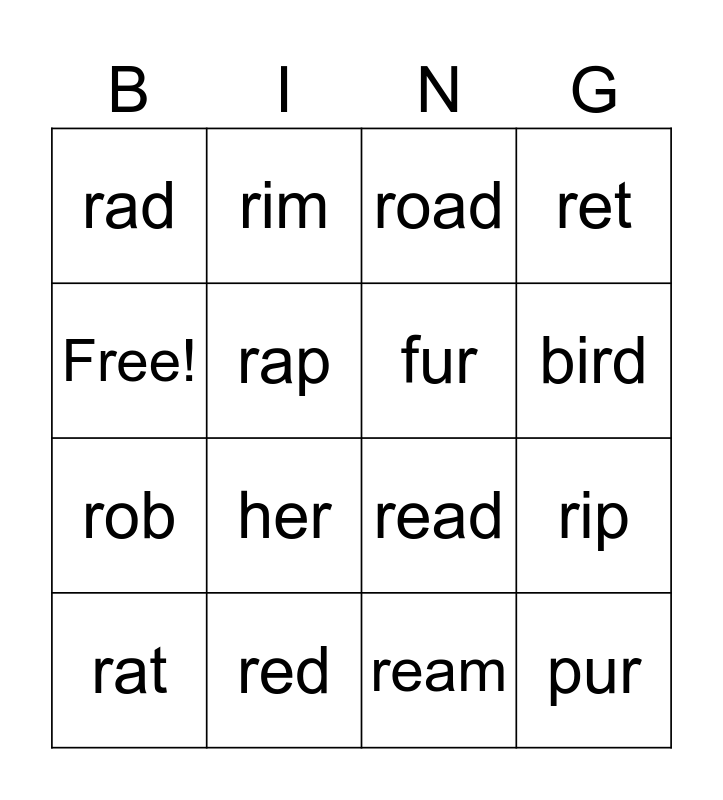 This bingo card has 16 words: red, rip, road, rad, rob, rim, read, ream, Free!, rap, rat, ret, her, bird, fur and pur.