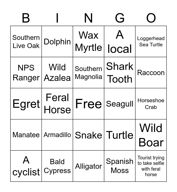 This bingo card has a free space and 24 words: Armadillo, Bald Cypress, Southern Magnolia, A cyclist, Loggerhead Sea Turtle, Southern Live Oak, NPS Ranger, Dolphin, Seagull, Snake, Shark Tooth, Egret, Turtle, Wild Boar, Wild Azalea, Spanish Moss, Horseshoe Crab, Wax Myrtle, Raccoon, Feral Horse, Tourist trying to take selfie with feral horse, Manatee, A local and Alligator.