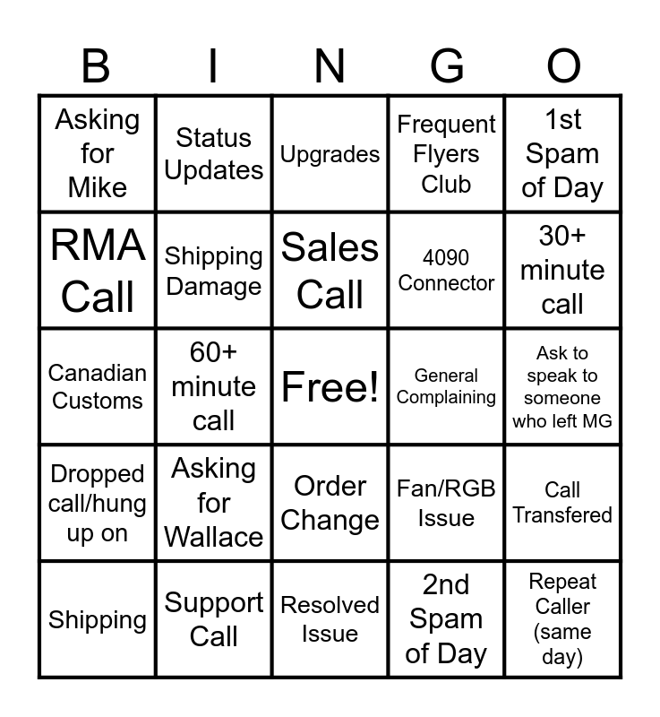 This bingo card has a free space and 24 words: Asking for Wallace, Support Call, Sales Call, Shipping, 1st Spam of Day, Asking for Mike, RMA Call, Status Updates, General Complaining, Order Change, 4090 Connector, Canadian Customs, Fan/RGB Issue, Call Transfered, Shipping Damage, 2nd Spam of Day, Ask to speak to someone who left MG, Upgrades, 30+ minute call, 60+ minute call, Repeat Caller (same day), Dropped call/hung up on, Frequent Flyers Club and Resolved Issue.