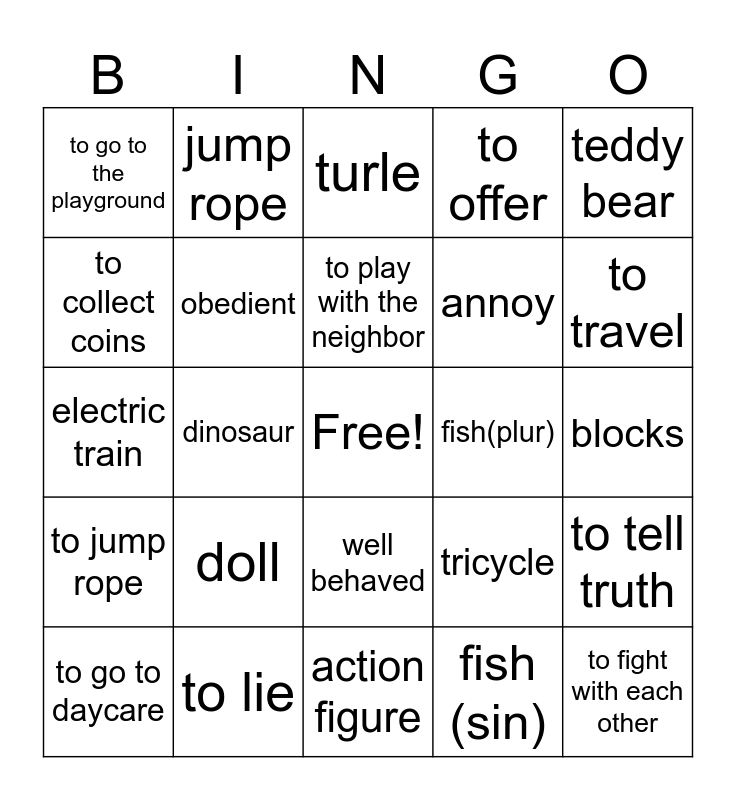 This bingo card has a free space and 24 words: doll, to lie, to play with the neighbor, to go to daycare, teddy bear, to go to the playground, to collect coins, jump rope, fish(plur), well behaved, annoy, electric train, tricycle, to tell truth, obedient, fish (sin), blocks, turle, to travel, dinosaur, to fight with each other, to jump rope, to offer and action figure.