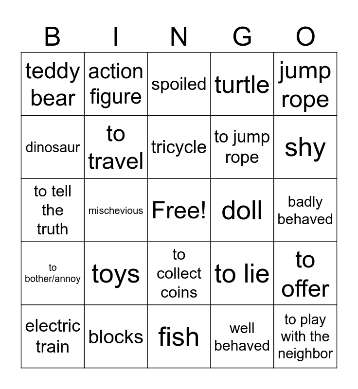This bingo card has a free space and 24 words: toys, blocks, tricycle, electric train, jump rope, teddy bear, dinosaur, action figure, doll, to collect coins, to jump rope, to tell the truth, to lie, to offer, to travel, well behaved, badly behaved, spoiled, shy, mischevious, to play with the neighbor, to bother/annoy, turtle and fish.