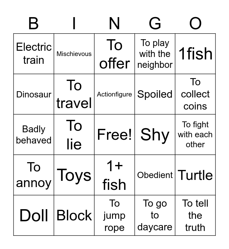 This bingo card has a free space and 24 words: Toys, Block, Actionfigure, Doll, 1fish, Electric train, Dinosaur, Mischievous, Shy, 1+ fish, Spoiled, Badly behaved, Obedient, Turtle, To travel, To go to daycare, To fight with each other, To offer, To collect coins, To lie, To tell the truth, To annoy, To play with the neighbor and To jump rope.
