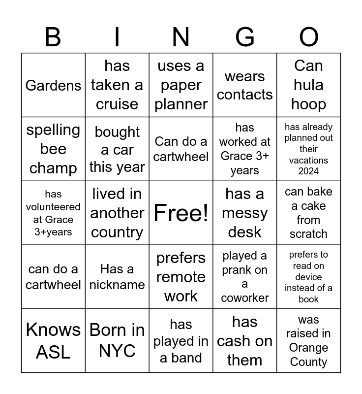 This bingo card has a free space and 24 words: Has a nickname, Born in NYC, Can do a cartwheel, Knows ASL, Can hula hoop, Gardens, spelling bee champ, has taken a cruise, has a messy desk, prefers remote work, has worked at Grace 3+ years, has volunteered at Grace 3+years, played a prank on a coworker, prefers to read on device instead of a book, bought a car this year, has cash on them, can bake a cake from scratch, uses a paper planner, has already planned out their vacations 2024, lived in another country, was raised in Orange County, can do a cartwheel, wears contacts and has played in a band.