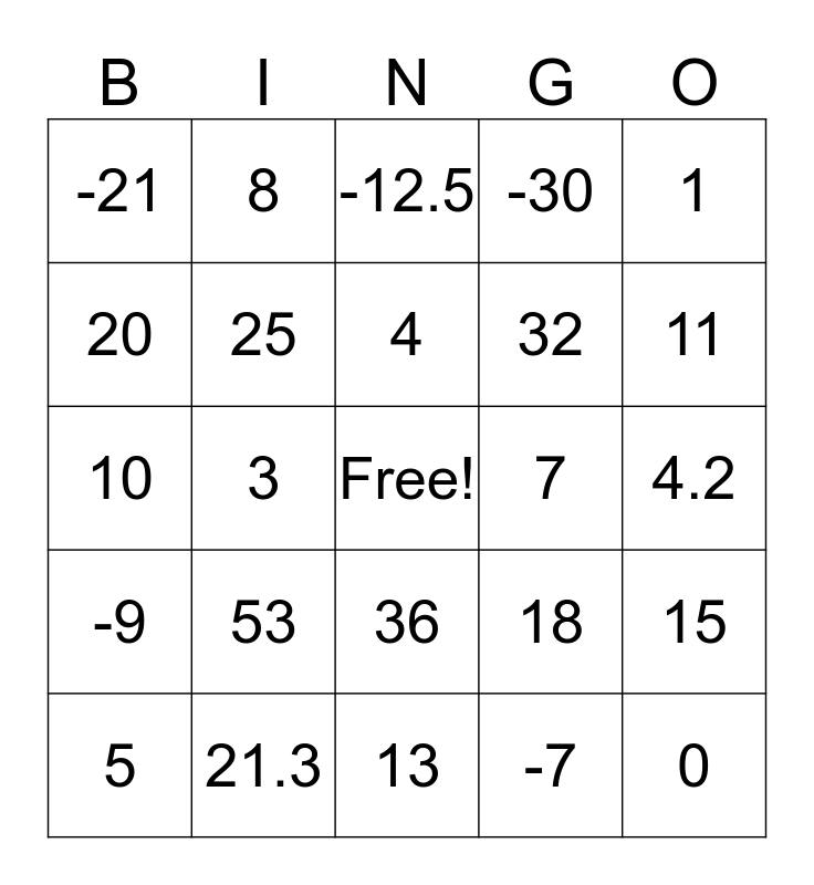This bingo card has a free space and 24 words: 53, 21.3, 4, 5, 1, -21, 20, 8, 7, 36, 32, 10, 18, 15, 25, -7, 4.2, -12.5, 11, 3, 0, -9, -30 and 13.