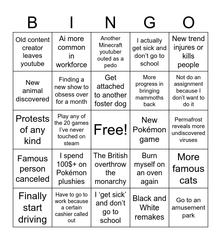 This bingo card has a free space and 24 words: I spend 100$+ on Pokémon plushies, Have to go to work because a certain cashier called out, Get attached to another foster dog, Finally start driving, New trend injures or kills people, Old content creator leaves youtube, New animal discovered, Ai more common in workforce, New Pokémon game, The British overthrow the monarchy, More progress in bringing mammoths back, Protests of any kind, Burn myself on an oven again, More famous cats, Finding a new show to obsess over for a month, Black and White remakes, Permafrost reveals more undiscovered viruses, Another Minecraft youtuber outed as a pedo, Not do an assignment because I don’t want to do it, Play any of the 20 games I’ve never touched on steam, Go to an amusement park, Famous person canceled, I actually get sick and don’t go to school and I ‘get sick’ and don’t go to school.