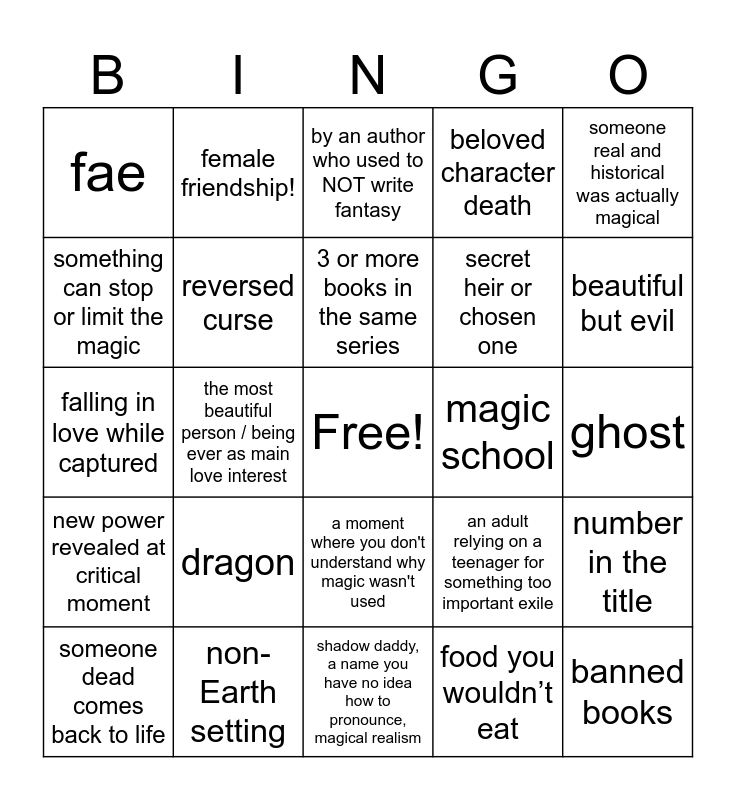This bingo card has a free space and 25 words: dragon, shadow daddy, a name you have no idea how to pronounce, magical realism, 3 or more books in the same series, someone dead comes back to life, someone real and historical was actually magical, fae, something can stop or limit the magic, female friendship!, magic school, a moment where you don't understand why magic wasn't used, secret heir or chosen one, falling in love while captured, an adult relying on a teenager for something too important exile, number in the title, reversed curse, 600+ pages, ghost, by an author who used to NOT write fantasy, beautiful but evil, the most beautiful person / being ever as main love interest, banned books, non-Earth setting, new power revealed at critical moment, beloved character death and food you wouldn’t eat.