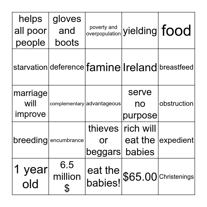 This bingo card has 37 words: sustenance, rudiment, collateral, deference, expedient, encumbrance, famine, propagation, food, foundation, complementary, yielding, advantageous, obstruction, starvation, breeding, Jonathan Swift, poverty and overpopulation, thieves or beggars, serve no purpose, helps all poor people, breastfeed, 1 year old, eat the babies!, Catholics, $65.00, gloves and boots, open butcher shops, meat is too tough, used for breeding stock, valuable, 6.5 million $, marriage will improve, Christenings, rich will eat the babies, Ireland and breeders.