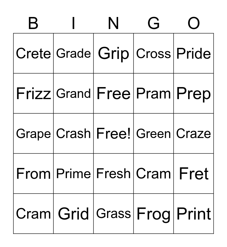 This bingo card has a free space and 24 words: Prime, Grid, Free, Cram, Pride, Crete, Frizz, Grade, Green, Fresh, Pram, Grape, Cram, Fret, Grand, Frog, Craze, Grip, Prep, Crash, Print, From, Cross and Grass.