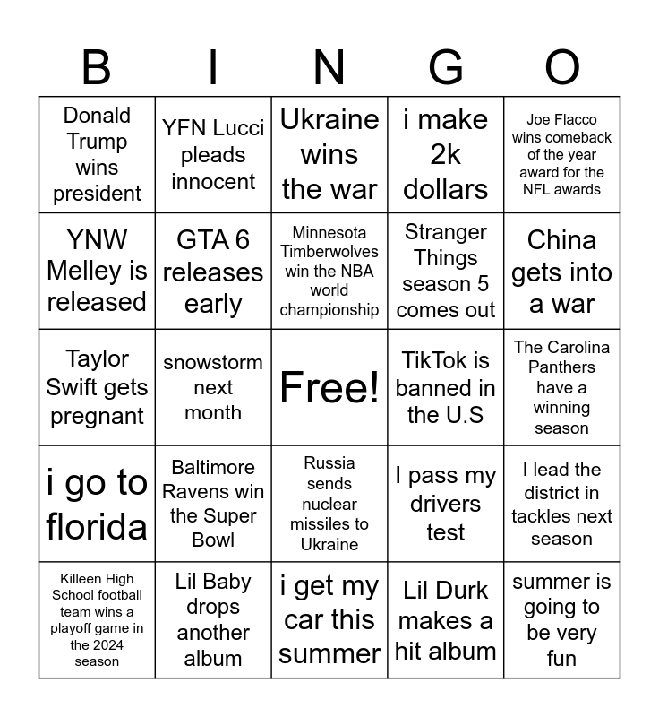 This bingo card has a free space and 24 words: Baltimore Ravens win the Super Bowl, Lil Baby drops another album, Minnesota Timberwolves win the NBA world championship, Killeen High School football team wins a playoff game in the 2024 season, Joe Flacco wins comeback of the year award for the NFL awards, Donald Trump wins president, YNW Melley is released, YFN Lucci pleads innocent, TikTok is banned in the U.S, Russia sends nuclear missiles to Ukraine, Stranger Things season 5 comes out, Taylor Swift gets pregnant, I pass my drivers test, I lead the district in tackles next season, GTA 6 releases early, Lil Durk makes a hit album, The Carolina Panthers have a winning season, Ukraine wins the war, China gets into a war, snowstorm next month, summer is going to be very fun, i go to florida, i make 2k dollars and i get my car this summer.
