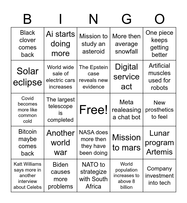 This bingo card has a free space and 24 words: Another world war, Biden causes more problems, The Epstein case reveals new evidence, Katt Williams says more in another interview about Celebs, One piece keeps getting better, Black clover comes back, Solar eclipse, Ai starts doing more, Meta realeasing a chat bot, NASA does more then they have been doing, Digital service act, Covid becomes more like common cold, Mission to mars, Lunar program Artemis, World wide sale of electric cars increases, World population increases to above 8 billion, New prosthetics to feel, Mission to study an asteroid, Artificial muscles used for robots, The largest telescope is completed, Company investment into tech, Bitcoin maybe comes back, More then average snowfall and NATO to strategize with South Africa.