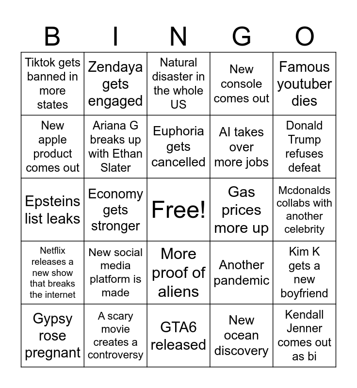 This bingo card has a free space and 24 words: New social media platform is made, A scary movie creates a controversy, Euphoria gets cancelled, Gypsy rose pregnant, Famous youtuber dies, Tiktok gets banned in more states, New apple product comes out, Zendaya gets engaged, Gas prices more up, More proof of aliens, AI takes over more jobs, Epsteins list leaks, Another pandemic, Kim K gets a new boyfriend, Ariana G breaks up with Ethan Slater, New ocean discovery, Mcdonalds collabs with another celebrity, Natural disaster in the whole US, Donald Trump refuses defeat, Economy gets stronger, Kendall Jenner comes out as bi, Netflix releases a new show that breaks the internet, New console comes out and GTA6 released.