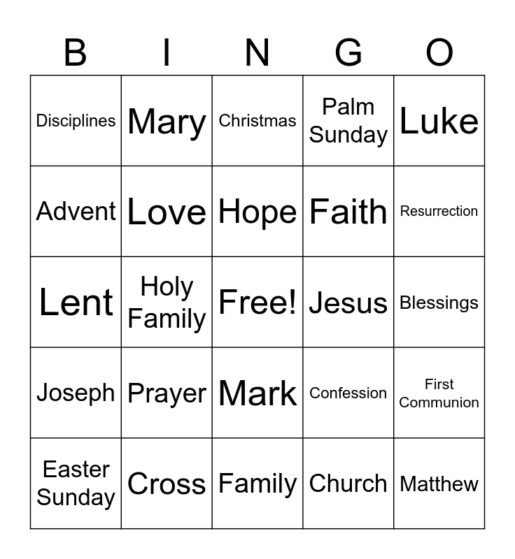This bingo card has a free space and 27 words: Confession, First Reconciliation, Faith, Family, Advent, Christmas, Mary, Joseph, Jesus, First Communion, Lent, Palm Sunday, Easter Sunday, Cross, Resurrection, Forgiveness, Love, Hope, Prayer, Disciplines, Blessings, Church, Holy Family, Matthew, Mark, Luke and John.