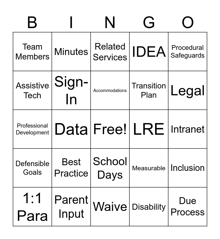 This bingo card has a free space and 59 words: Additional Notes, Parent Input, Completed IEP, Defensible Goals, Disability, Eligibility, Sign-In, BIP, Transition Plan, General Education, IDEA, 3 Yr. Re-eval, Assistive Tech, FBA, Student Strengths, Team Members, Due Process, Procedural Safeguards, Parent Consent, Accommodations, LRE, Related Services, 1:1 Para, Inclusion, Invite, ESY, Documentation, Conference Summary Page, Legal, LEA, Facilitate, Procedurally Correct, Implementation, Services, Minutes, IEP Meeting, Staff, Data, Communication, Professional Development, Assessment, Best Practice, Intranet, Purpose, Written Notice, Modifications, Support, Calendar Days, School Days, Waive, Notification of Conference, ISBE, IEP Meeting Agenda, Excusal Letter, PLOP, Measurable, Benchmark, Objective and Criteria.
