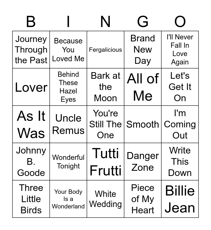 This bingo card has a free space and 46 words: Rocket Man, Billie Jean, You Can Call Me Al, White Wedding, Wonderful Tonight, Rocky Mountain High, Because You Loved Me, I Won't Back Down, Lover, Sailing, Behind These Hazel Eyes, Brand New Day, Write This Down, Danger Zone, I Like It, I Love It, Love Yourself, Bark at the Moon, Smooth, Sledgehammer, I'll Never Fall In Love Again, Uncle Remus, Piece of My Heart, Journey Through the Past, All of Me, Cruisin', Let's Get It On, Three Little Birds, All Along the Watchtower, Tutti Frutti, Johnny B. Goode, Show Me The Way, Edge of Seventeen, Careless Whisper, Life's Been Good, Got My Mind Set on You, Your Body Is a Wonderland, I'm Coming Out, Hotline Bling, How Do You Like Me Now?!, We Found Love, Heartless, Fergalicious, As It Was, Mammas Don't Let Your Babies Grow up to Be Cowboys, It's Too Late and Let's Stay Together.