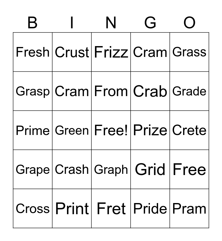 This bingo card has a free space and 24 words: Crash, Print, From, Cross, Grass, Fresh, Grasp, Crust, Prize, Graph, Crab, Prime, Grid, Free, Cram, Pride, Crete, Frizz, Grade, Green, Pram, Grape, Cram and Fret.