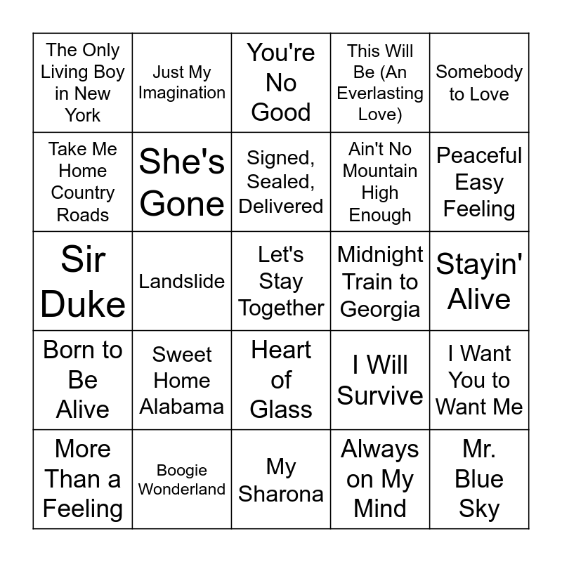 This bingo card has 81 words: You've Got a Friend, You're the One that I Want, You're No Good, You're My Best Friend, You Make Me Feel Like Dancing, You Make Loving Fun, Y.M.C.A, What's Going On, We've Only Just Begun, We Are Family, Vienna, Tiny Dancer, This Will Be (An Everlasting Love), The Only Living Boy in New York, The Long and Winding Road, Take Me Home Country Roads, Take A Chance On Me, Sweet Home Alabama, Strawberry Letter 23, Stayin' Alive, Stairway to Heaven, Somebody to Love, Sir Duke, Signed, Sealed, Delivered, She's Gone, September, Rich Girl, Rhiannon, Reminiscing, Piano Man, Peaceful Easy Feeling, No Woman, No Cry, My Sharona, Mr. Blue Sky, More Than a Feeling, Midnight Train to Georgia, Me and Julio Down by the Schoolyard, Maybe I'm Amazed, Love Train, Love Really Hurts Without You, Let's Stay Together, Let's Get It On, Lean on Me, Le Freak, Landslide, Knock Three Times, Just My Imagination, Jolene, It's Too Late, I'm Every Woman, I Will Survive, I Want You to Want Me, I Think I Love You, I Feel the Earth Move, I Can See Clearly Now, How Deep is Your Love, Hotel California, Hot Stuff, Hopelessly Devoted to You, Hooked on a Feeling, Heart of Glass, Have You Ever Seen the Rain, Feel Like Makin' Love, Escape (PinaColada), Dreams, Don't Stop 'til You Get Enough, Don't Go Breaking My Heart, December, 1963, Dancing Queen, Dancing in the Moonlight, Burning Love, Born to Be Alive, Boogie Wonderland, Bohemian Rhapsody, Best of My Love, Annie's Song, American Pie, Always on My Mind, Ain't No Sunshine, Ain't No Mountain High Enough and ABC.