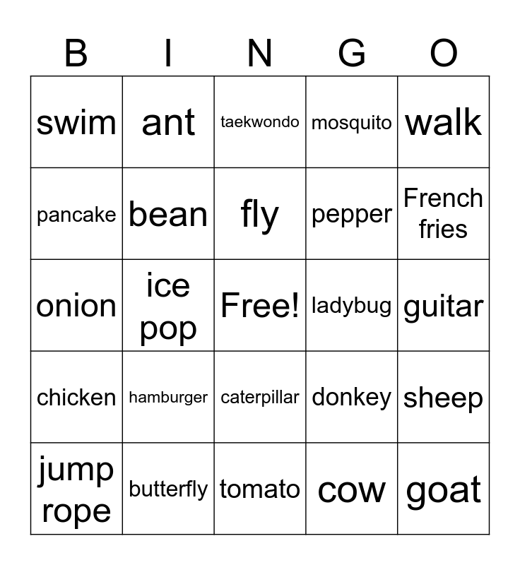 This bingo card has a free space and 24 words: hamburger, butterfly, fly, jump rope, walk, swim, pancake, ant, ladybug, caterpillar, pepper, onion, donkey, sheep, bean, cow, guitar, taekwondo, French fries, ice pop, goat, chicken, mosquito and tomato.