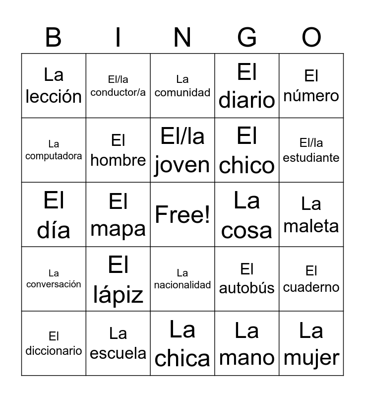This bingo card has a free space and 27 words: El autobús, La capital, El chico, La chica, La computadora, La comunidad, El/la conductor/a, La conversación, La cosa, El cuaderno, El día, El diario, El diccionario, La escuela, El/la estudiante, La foto(grafía), El hombre, El/la joven, El lápiz, La lección, La maleta, La mano, El mapa, La mujer, La nacionalidad, El número and El país.