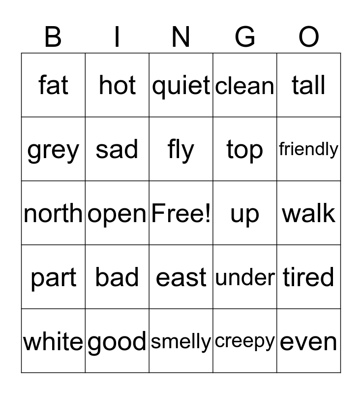 This bingo card has a free space and 24 words: bad, good, fly, white, tall, fat, grey, hot, up, east, top, north, under, tired, sad, creepy, walk, quiet, friendly, open, even, part, clean and smelly.