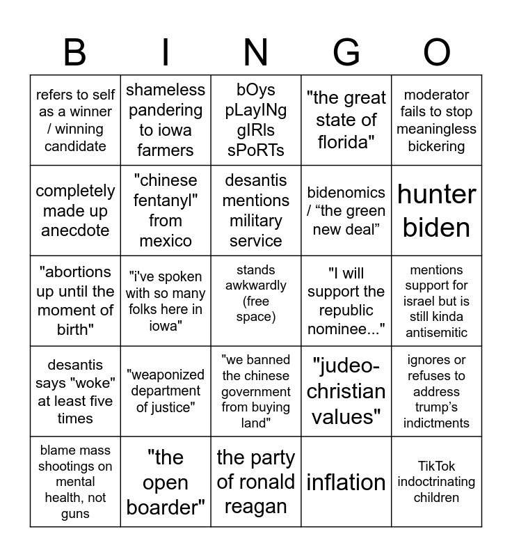This bingo card has a free space and 28 words: ignores or refuses to address trump’s indictments, gas prices, bidenomics / “the green new deal”, inflation, completely made up anecdote, bOys pLayINg gIRls sPoRTs, shameless pandering to iowa farmers, desantis says "woke" at least five times, "I will support the republic nominee...", blame mass shootings on mental health, not guns, "abortions up until the moment of birth", "the great state of florida", "the open boarder", the party of ronald reagan, hunter biden, "the liberal fake news media", "weaponized department of justice", "chinese fentanyl" from mexico, desantis mentions military service, "we banned the chinese government from buying land", refers to self as a winner / winning candidate, "everyday americans", TikTok indoctrinating children, "i've spoken with so many folks here in iowa", mentions support for israel but is still kinda antisemitic, "judeo-christian values", moderator fails to stop meaningless bickering and nikki haley mentions being a mom.