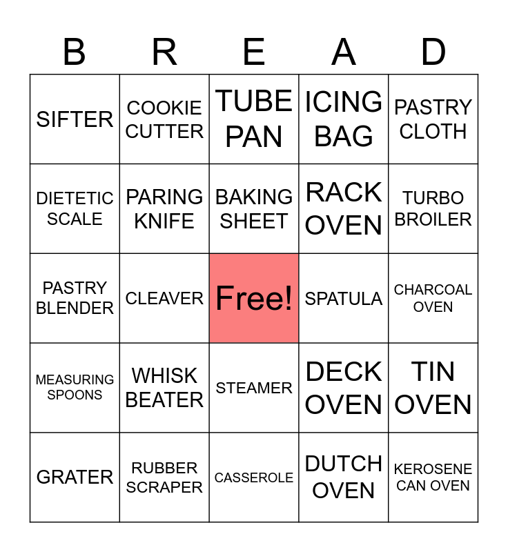 This bingo card has a free space and 24 words: GRATER, WHISK BEATER, BAKING SHEET, DUTCH OVEN, PASTRY CLOTH, SIFTER, COOKIE CUTTER, TUBE PAN, SPATULA, CHARCOAL OVEN, PASTRY BLENDER, PARING KNIFE, DECK OVEN, TIN OVEN, DIETETIC SCALE, RUBBER SCRAPER, CASSEROLE, ICING BAG, TURBO BROILER, MEASURING SPOONS, CLEAVER, STEAMER, RACK OVEN and KEROSENE CAN OVEN.