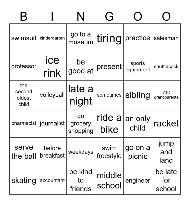 This bingo card has 52 words: Free!, the second oldest child, the middle child, an only child, sibling, middle school, kindergarten, elementary school, salesman, engineer, professor, accountant, journalist, pharmacist, weekend, skating, ice rink, volleyball, baseball field, practice, shuttlecock, racket, swimsuit, be good at, dribble the ball, serve the ball, swim freestyle, always, present, weekdays, exciting, tiring, relaxing, eat out, go on a picnic, go to a museum, ride a bike, be kind to friends, be late for school, every other Sunday, in the early morning, late a night, sometimes, often, visit grandparents, before breakfast, jump and land, sports equipment, college, the youngest child, go grocery shopping and see a movie.
