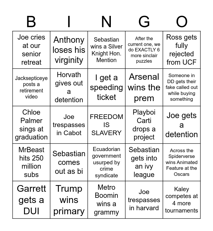 This bingo card has a free space and 24 words: Sebastian comes out as bi, Trump wins primary, I get a speeding ticket, Garrett gets a DUI, Ross gets fully rejected from UCF, Joe cries at our senior retreat, Jacksepticeye posts a retirement video, Anthony loses his virginity, Playboi Carti drops a project, Ecuadorian government usurped by crime syndicate, Arsenal wins the prem, Chloe Palmer sings at graduation, Sebastian gets into an ivy league, Across the Spiderverse wins Animated Feature at the Oscars, Horvath gives out a detention, Joe trespasses in harvard, Joe gets a detention, Sebastian wins a Silver Knight Hon. Mention, Someone in DD gets their fake called out while buying something, Joe trespasses in Cabot, Kaley competes at 4 more tournaments, MrBeast hits 250 million subs, After the current one, we do EXACTLY 6 more sinclair puzzles and Metro Boomin wins a grammy.