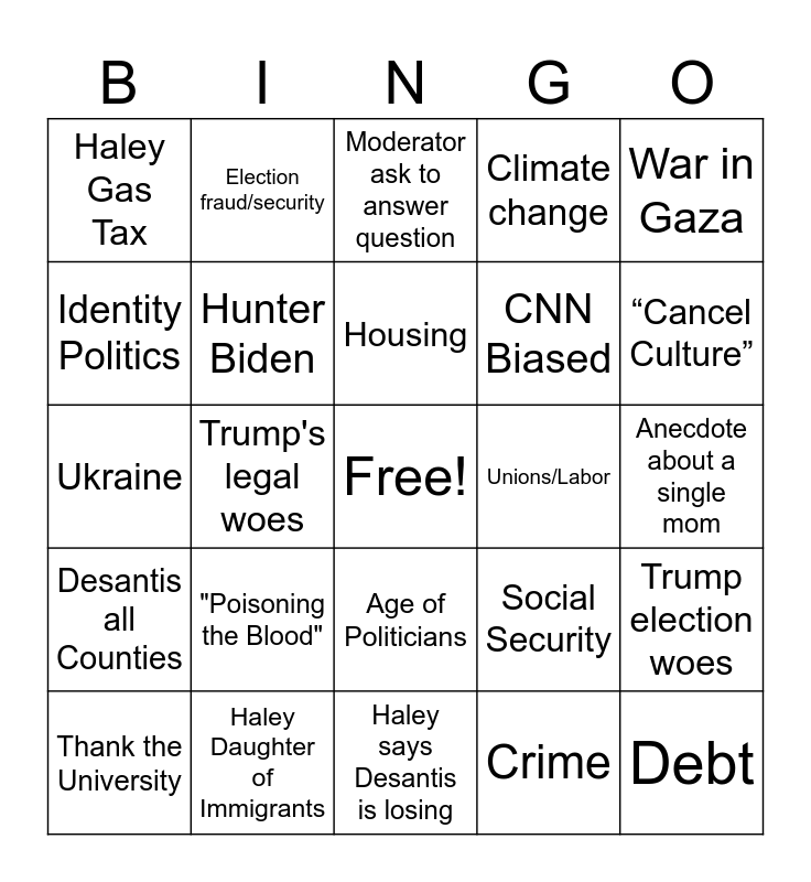 This bingo card has a free space and 24 words: "Poisoning the Blood", Haley Daughter of Immigrants, Housing, Thank the University, War in Gaza, Haley Gas Tax, Identity Politics, Election fraud/security, Unions/Labor, Age of Politicians, CNN Biased, Ukraine, Social Security, Trump election woes, Hunter Biden, Crime, Anecdote about a single mom, Moderator ask to answer question, “Cancel Culture”, Trump's legal woes, Debt, Desantis all Counties, Climate change and Haley says Desantis is losing.