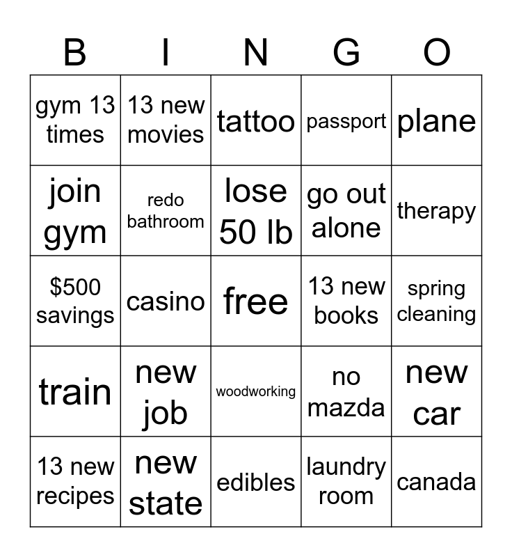 This bingo card has a free space and 24 words: new job, new state, lose 50 lb, 13 new recipes, plane, gym 13 times, join gym, 13 new movies, 13 new books, woodworking, go out alone, $500 savings, no mazda, new car, redo bathroom, laundry room, spring cleaning, tattoo, therapy, casino, canada, train, passport and edibles.
