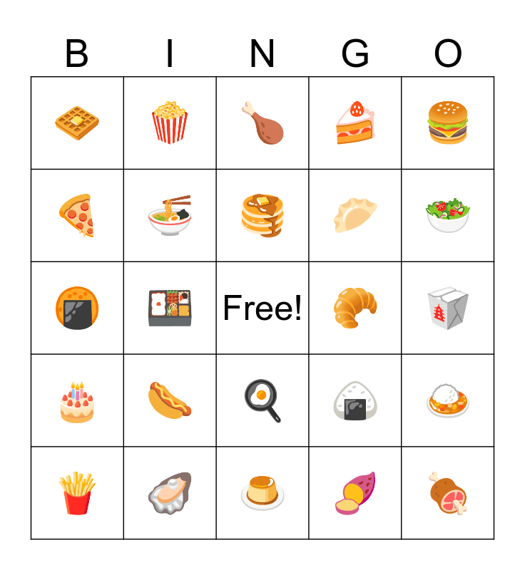 This bingo card has a free space and 24 words: 🌭, 🦪, 🥞, 🍟, 🍔, 🧇, 🍕, 🍿, 🥐, 🍳, 🥟, 🍘, 🍙, 🍛, 🍜, 🍠, 🥡, 🍗, 🥗, 🍱, 🍖, 🎂, 🍰 and 🍮.