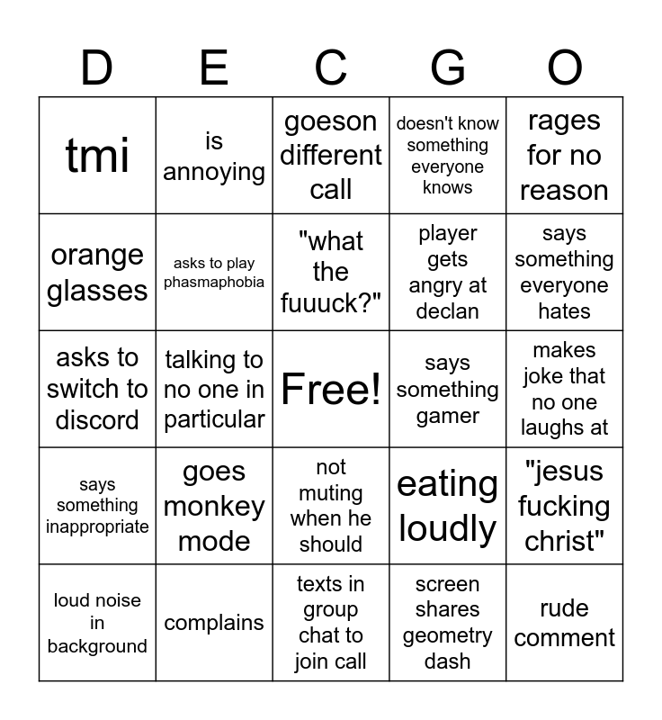 This bingo card has a free space and 34 words: Asks to play Pico Park, screen shares geometry dash, says bruh, says cus word, says something inappropriate, asks to play phasmaphobia, rages for no reason, loud noise in background, is annoying, deny something he did, "what the fuuuck?", goeson different call, gets kicked, leaves because nothing is happening, says something gamer, says something everyone hates, complains, asks to switch to discord, goes monkey mode, eating loudly, not muting when he should, jamie laughs, tmi, makes joke that no one laughs at, texts in group chat to join call, rude comment, doesn't know something everyone knows, "I'm bi-myself", player gets angry at declan, orange glasses, accuses of gaslighting, talking to no one in particular, "jesus fucking christ" and that weird laugh that sounds like a moan.