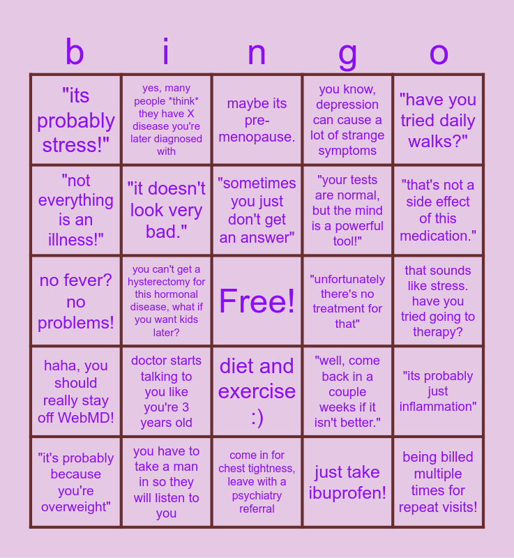 This bingo card has a free space and 24 words: doctor starts talking to you like you're 3 years old, you have to take a man in so they will listen to you, "sometimes you just don't get an answer", "it's probably because you're overweight", "have you tried daily walks?", "its probably stress!", "not everything is an illness!", yes, many people *think* they have X disease you're later diagnosed with, "unfortunately there's no treatment for that", diet and exercise :), "your tests are normal, but the mind is a powerful tool!", no fever? no problems!, "well, come back in a couple weeks if it isn't better.", "its probably just inflammation", "it doesn't look very bad.", just take ibuprofen!, that sounds like stress. have you tried going to therapy?, maybe its pre-menopause., "that's not a side effect of this medication.", you can't get a hysterectomy for this hormonal disease, what if you want kids later?, being billed multiple times for repeat visits!, haha, you should really stay off WebMD!, you know, depression can cause a lot of strange symptoms and come in for chest tightness, leave with a psychiatry referral.