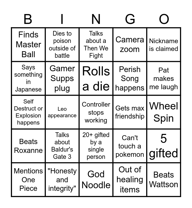 This bingo card has 38 words: Free!, New run, Destiny Bond happens, Gamer Supps plug, 5 gifted, Talks about Baldur's Gate 3, Rolls a die, Pets Subnoodle, Nickname is claimed, Perish Song happens, Leo appearance, Camera zoom, Controller stops working, Wheel Spin, Says something in Japanese, Beats Roxanne, References being ginger, Talks about a Then We Fight, Rolls Huge Power or Pure Power, Gets max friendship, Finds Master Ball, "Honesty and integrity", Pat makes me laugh, Mentions One Piece, Mentions Shedinja or Wonder Guard, God Noodle, Beats Wattson, Dies to OHKO move, Accidentally KOs a wild mon, "Chat type 1", Asks Siri a question, 20+ gifted by a single person, Out of healing items, Dies to poison outside of battle, Talks about another Poketuber, Can't touch a pokemon, Self Destruct or Explosion happens and Uses a Mega Evolution.