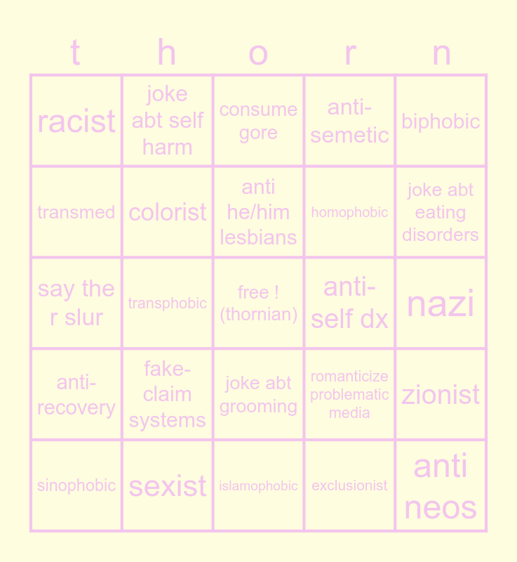 This bingo card has a free space and 28 words: radfem, sexist, anti he/him lesbians, exclusionist, biphobic, racist, colorist, islamophobic, anti-self dx, zionist, say the r slur, transphobic, romanticize problematic media, anti neos, transmed, alt-right, joke abt grooming, anti-semetic, joke abt eating disorders, sinophobic, joke abt self harm, say slurs u cant reclaim, homophobic, nazi, anti-recovery, fake-claim systems, consume gore and anti blm.