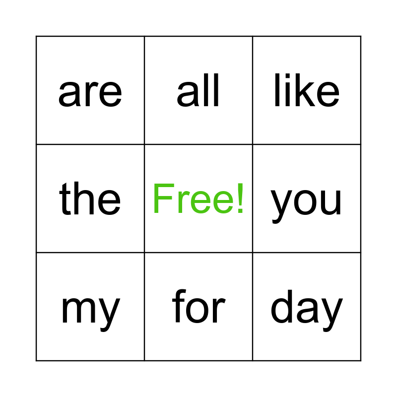This bingo card has a free space and 11 words: she, for, day, my, all, like, you, to, the, are and of.